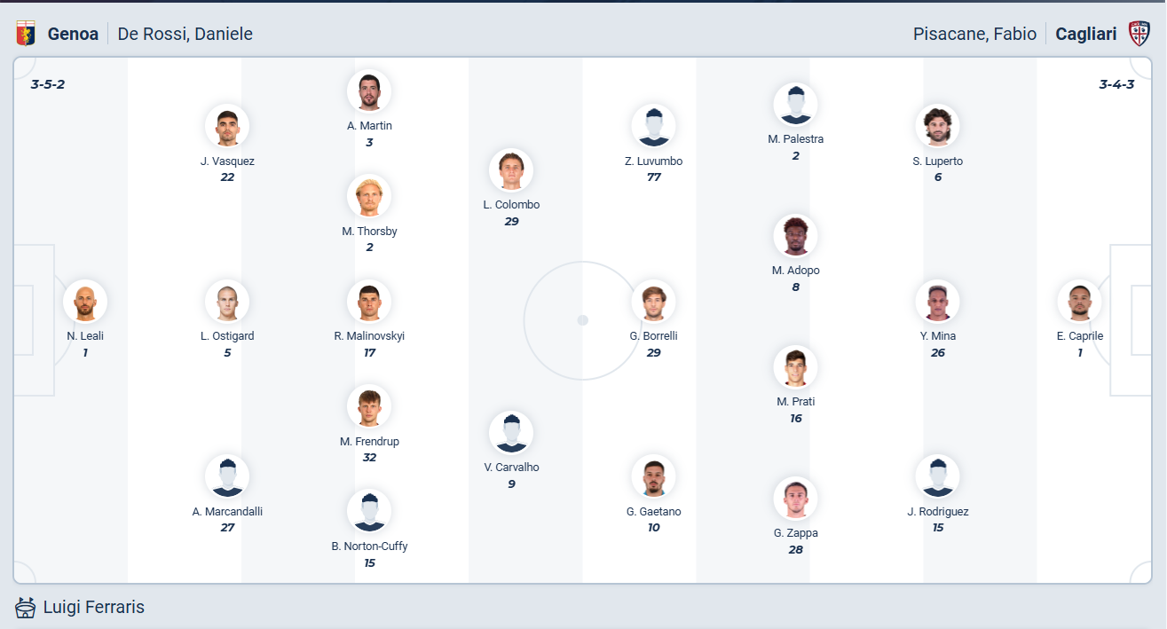 Genoa không phải đội bóng mạnh của Serie A, họ chơi không đến nỗi nào mùa giải trước khi đứng thứ 13 trên bảng xếp hạng. Mùa giải năm mọi thứ đã tệ hơn rất nhiều với thầy trò HLV Daniele De Rossi khi họ không thắng ở các trận gần nhất và tụt xuống vị trí thứ 17, chỉ còn hơn nhóm xuống hạng 3 điểm. Các cầu thủ Genoa rất cần chiến thắng ở vòng đấu thứ 20 này để hy vọng có vị trí tốt hơn trên bảng xếp hạng, tuy nhiên trận đấu với Cagliari không bao giờ dễ dàng, nhiều khả năng Genoa sẽ chỉ có được kết quả hòa.